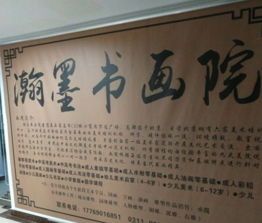 瀚墨書畫院,坐落在石家莊市CBD核心商圈萬(wàn)達(dá)廣場(chǎng)與勒泰中心兩家校區(qū);總部位于北京,目前在河北、北京、青島全國(guó)多個(gè)地區(qū)分布多家美術(shù)培訓(xùn)機(jī)構(gòu)。是河北省專業(yè)的美術(shù)與書法培訓(xùn)機(jī)構(gòu)。師資卓越、設(shè)施高端、環(huán)境雅致;教室視野開闊,對(duì)面即可領(lǐng)略世紀(jì)高爾夫球場(chǎng)風(fēng)景。另簽約國(guó)家一級(jí)美術(shù)師定期開展文化藝術(shù)交流、出國(guó)游學(xué)、美術(shù)賽事等藝術(shù)活動(dòng)。