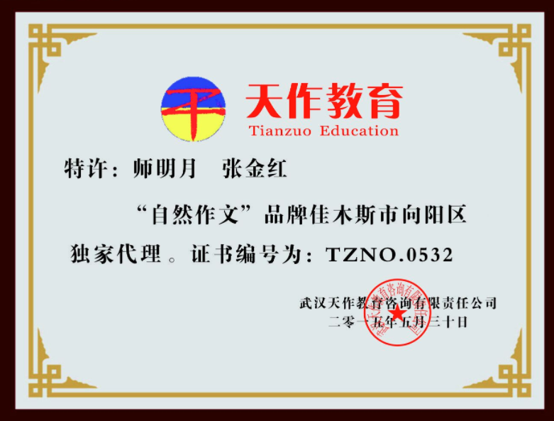 兩套教材均榮獲中語會“十一五”重點科研課題研究成果校本教材一等獎,并作為中國教育學會中學語文教學專業委員會“十二五”重點科研課題單獨立項。2011年8月《自然作文》系列教材作為全國中語會“十一五”重要科研成果送往國家教育部參加成果展示。目前武漢天作教育已在全國各地開設加盟分校350多家。