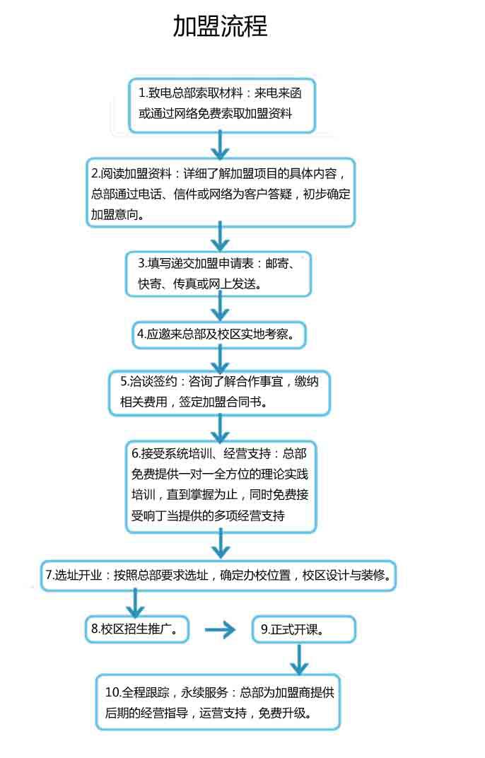 11.后期運(yùn)營(yíng)指導(dǎo):運(yùn)營(yíng)上實(shí)行區(qū)域制,統(tǒng)一由運(yùn)營(yíng)中心負(fù)責(zé),包括運(yùn)作成本控制,及連鎖校區(qū)形象監(jiān)督,經(jīng)營(yíng)策劃指導(dǎo),活動(dòng)方案設(shè)計(jì)等,為投資者盈利提供強(qiáng)有力的保證,確保各分校區(qū)以專業(yè)方法運(yùn)作。