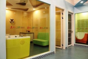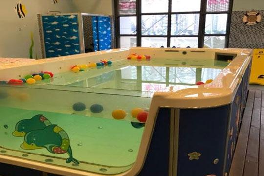 章魚堡水育體驗館在游泳的器材上,對傳統的泳池進行了重新設計,在國內首先采用透明泳池,提高了嬰兒游泳的成功率。因為嬰兒能有更寬的視角,游泳時能看到所熟悉的人,會感覺更放心,哭的機會大大減少了。另外也使得嬰兒游泳從簡單的保健服務變得更具可觀性,家長能在恒溫室外欣賞到寶寶游泳的全貌,是一件非常快樂的事情。除了游泳池的改進,我們還設計了一套符合商業需求的供水系統,我們在商業經營中總結出來的供水的能力是嬰兒游泳的關鍵。沒有強的供水能力,根本就談不上正常的營業。我們的供水系統在我們總店得到了驗證,使我們的服務能力得到了很大的提高。