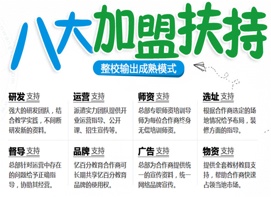 1.憶百分全腦教育是從快速記憶實際教學中成長起來的,積累有豐富教學、管理、研發等實操性經驗,在后期對加盟店的技術支持和服務方面完全優于那些無培訓經驗的“加盟公司”。