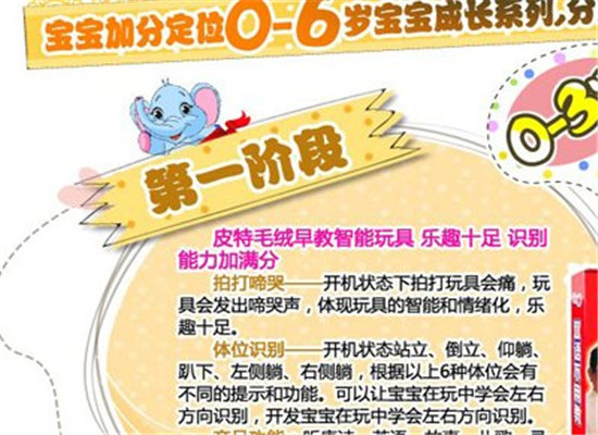 第一階段智能玩具:適用范圍0-3歲;通過生動、可愛的卡通形象刺激寶寶學習欲望,使寶寶學到知識,更開發他的邏輯思維能力和方向感,做到大腦小腦的均衡發展。