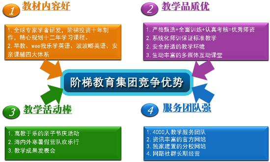 階梯英語以成為中國兒童英語教育培訓第一品牌為奮斗目標,擁有遍布全國76個主要城市的133家培訓學校,學生超過30000名,員工近3000人。20年來,多少父母因階梯而重樹了希望,多少孩子因階梯而改變了一生。為了夢想不辭辛勞的階梯人走遍大北,服務千家萬戶,為中國兒童英語教育的提升作出了卓越貢獻!