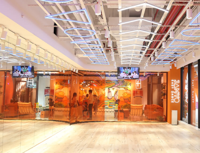 JAMYO街舞醬意指教授推廣專業且有趣的舞蹈,讓更多人愛上街舞。為年輕一代消費者創建一種新的、健康的運動及生活方式。舞蹈室總體風格,燈光設計,地板裝橫,及VI元素都沿用了JAMYO街舞醬主色調“活力橙”進行延申干凈簡潔,高端大氣的整體感覺,使所見之人皆留下了深刻的印象。