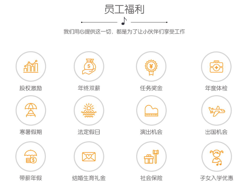 社會保險、年度體檢、國家法定假期、寒暑假期、股權激勵、豐富的員工活動、演出機會、出國機會、員工子女入學優惠。